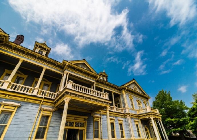 POINTブルーグレーとイエローの美しい洋風建築物の旧函館区公会堂