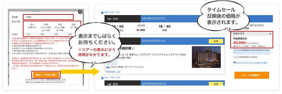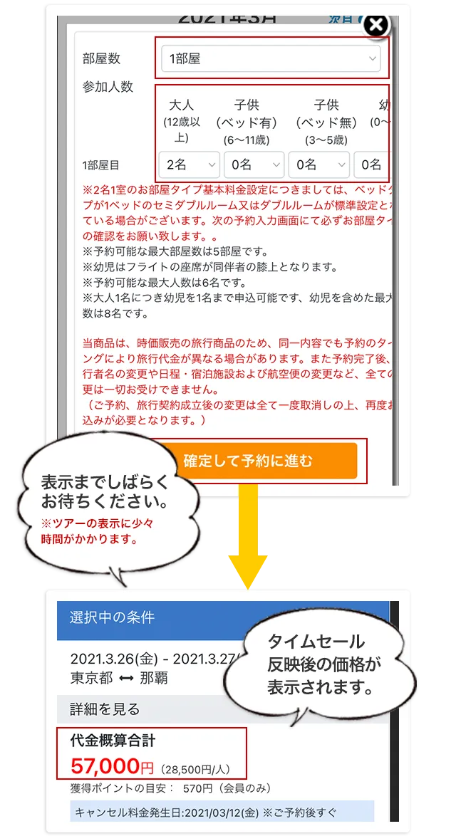 ③部屋数・参加人数を入力し「確定して予約に進む」をクリック